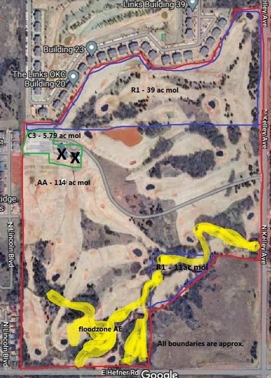Calling all ENTREPRENUERS and INVESTORS. Unbelievable opportunity to own the property previously occupied by Silverhorn Golf Club. Total of 170 acres MOL in OKC, close to Edmond and easy 15 min drive to downtown OKC. Amazing location, 3/4 mile east of Broadway Ext and 1 mile south of Kilpatrick Tpke. 50 acres MOL zoned R-1 residential, 114 acres MOL zoned AA agricultural (which allows for residential on 5 acre lots), and a 5.79 acre PUD zoned C3 community commercial where the clubhouse was located. Electricity, water and sewer, currently in surrounding area, so should be easy to establish for any development. A small section of the R-1 area at the lower right quadrant of the property is in floodzone AE.